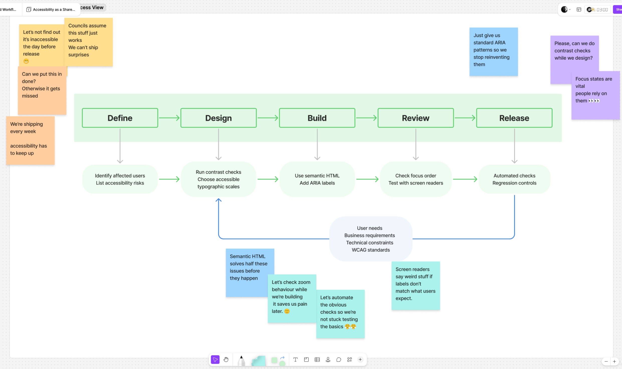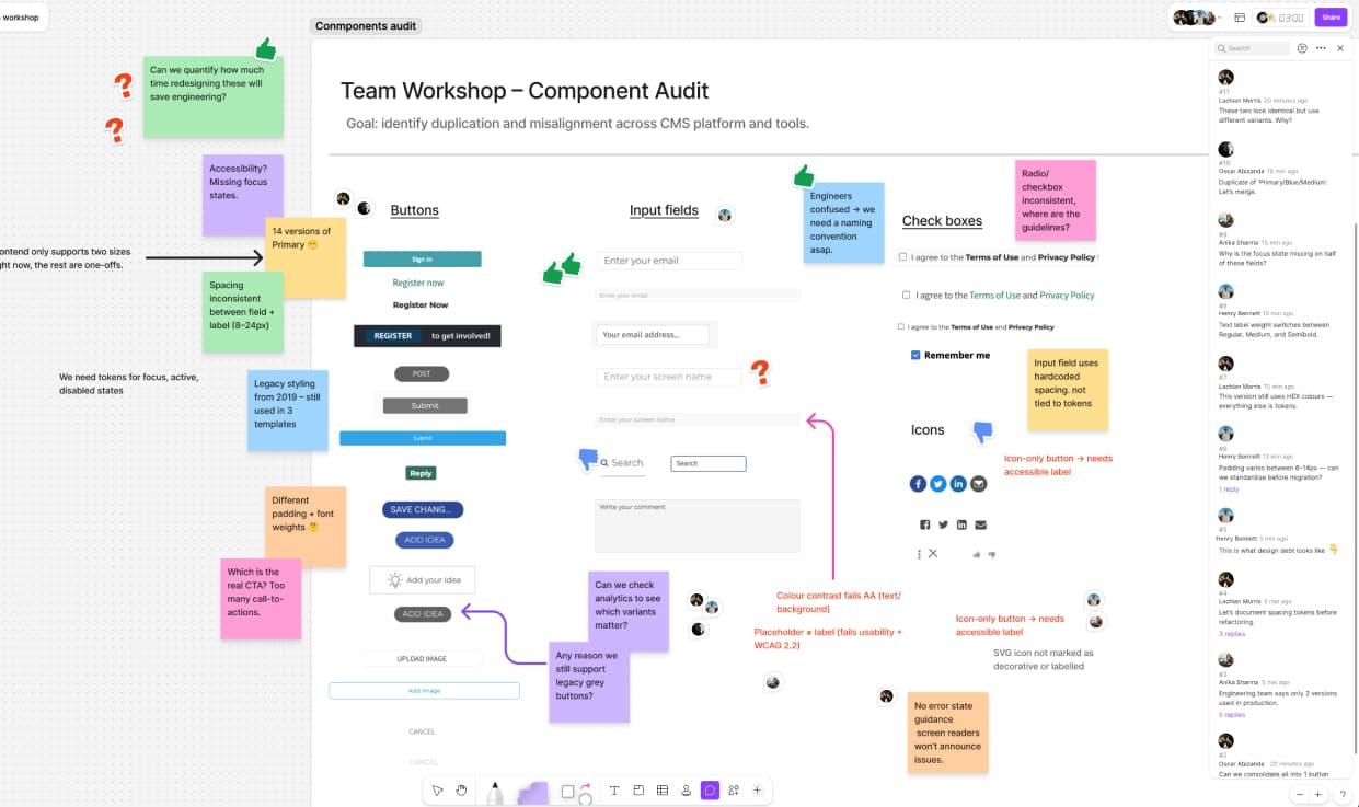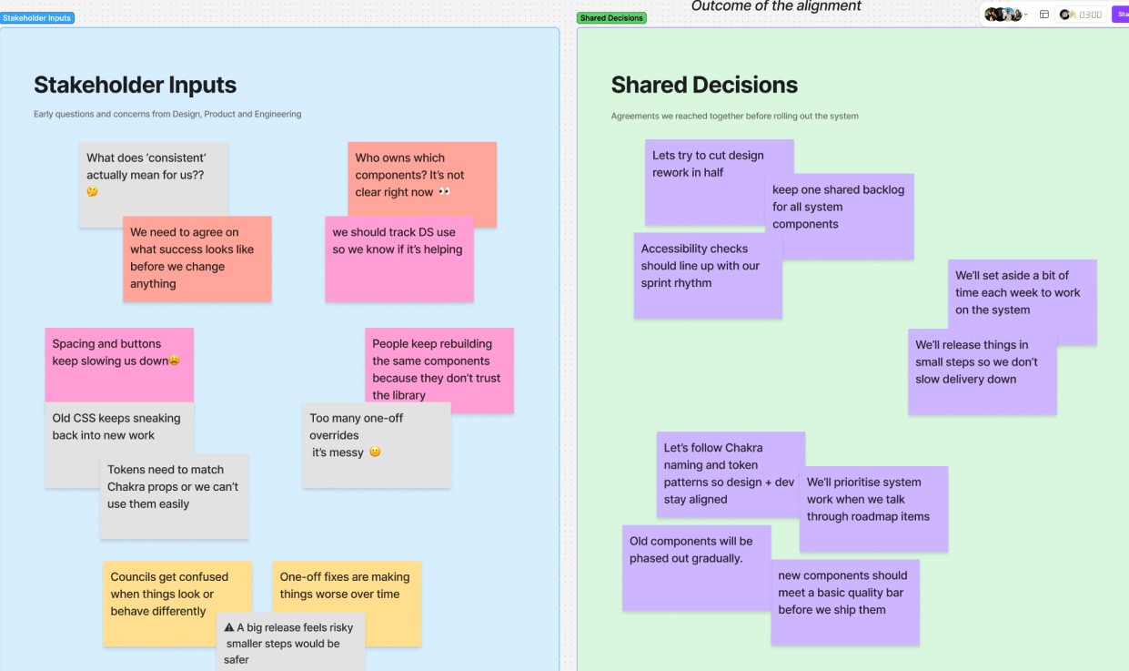 I met with the Head of Product, the Engineering Manager and the Head of Design to agree on what success meant from a business point of view. We focused on outcomes that mattered: faster delivery, lower maintenance and consistent compliance. Together, we set a few simple goals — halve design rework, align accessibility reviews with sprint cadence, and create a shared backlog for system components.